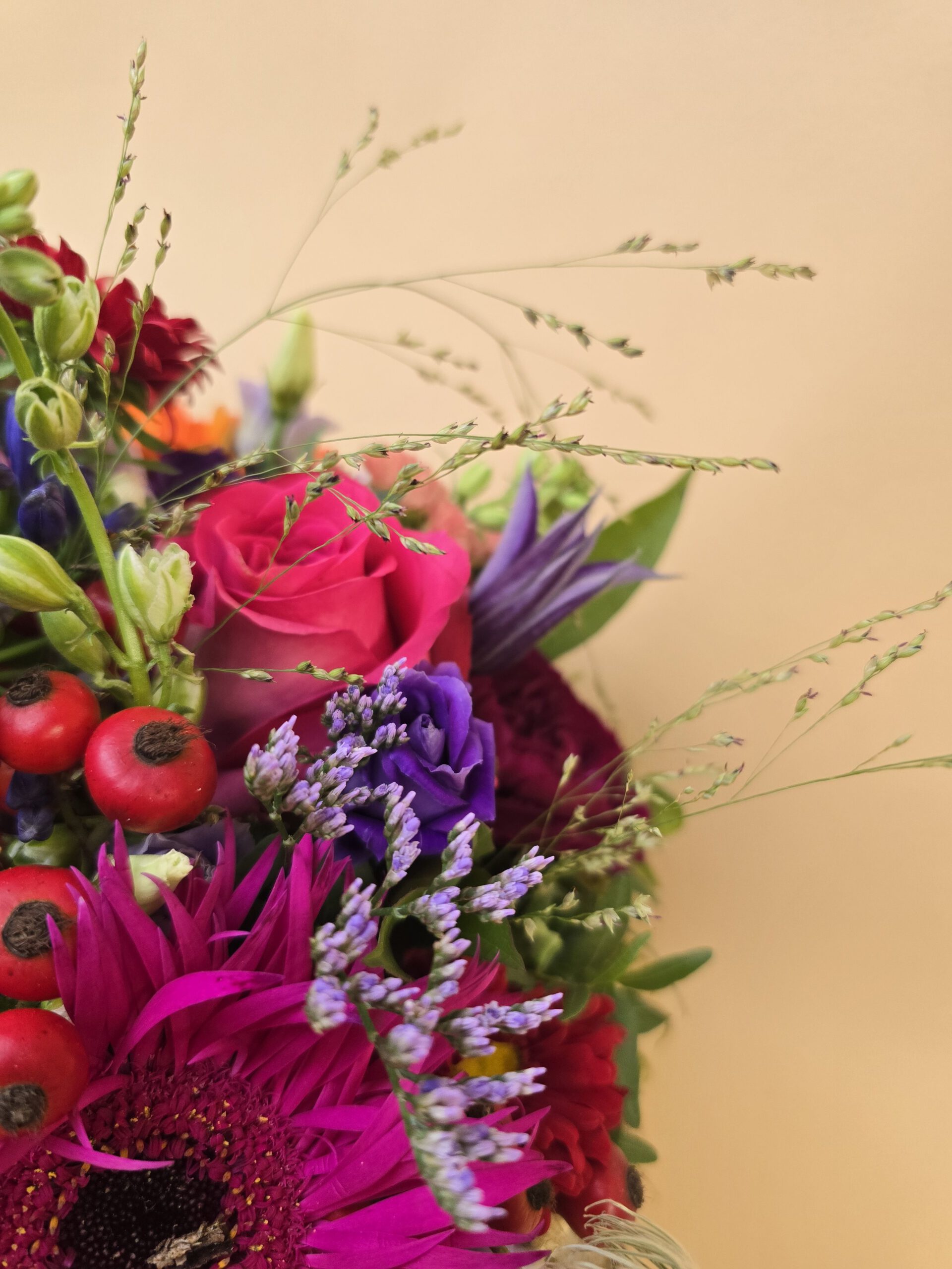 De samenstelling hangt af van het dag verse aanbod op de bloemenveiling en kan daardoor variëren. We kiezen elke dag de mooiste bloemen van het moment passen bij het seizoen.