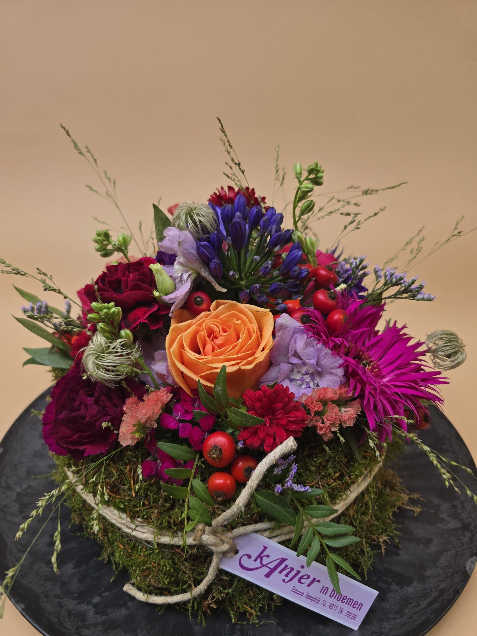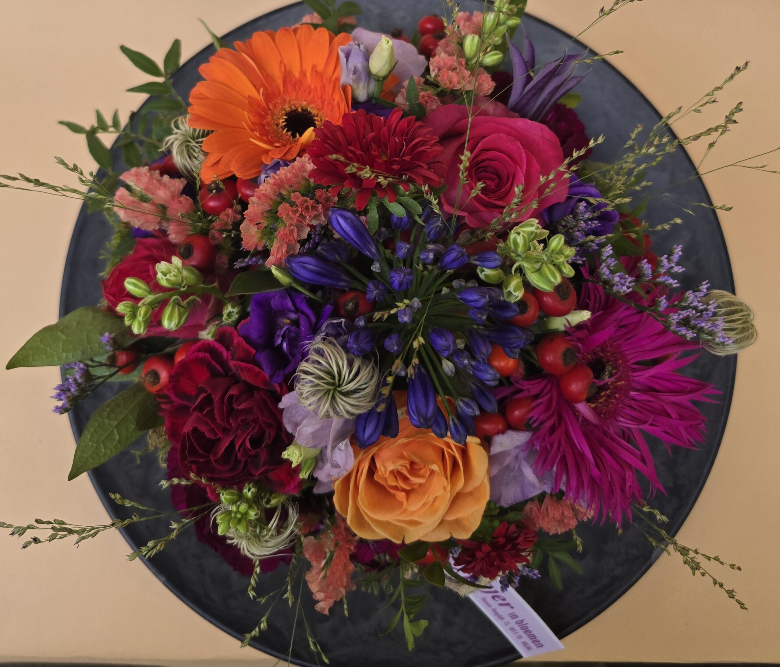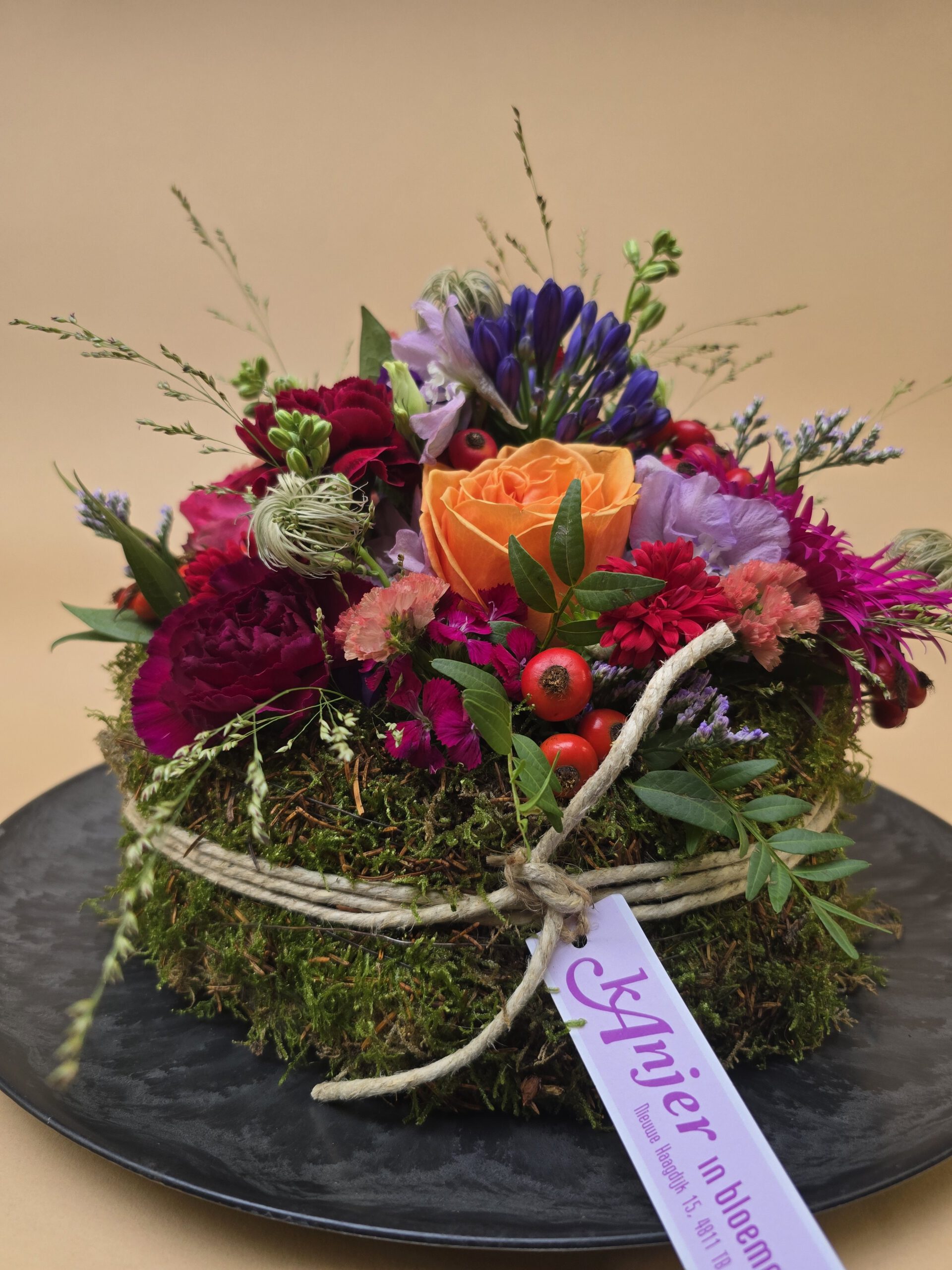 Handgemaakte bloementaart (30cm) op een antraciet onderbord (40cm) gemaakt met verse bloemen van het seizoen.