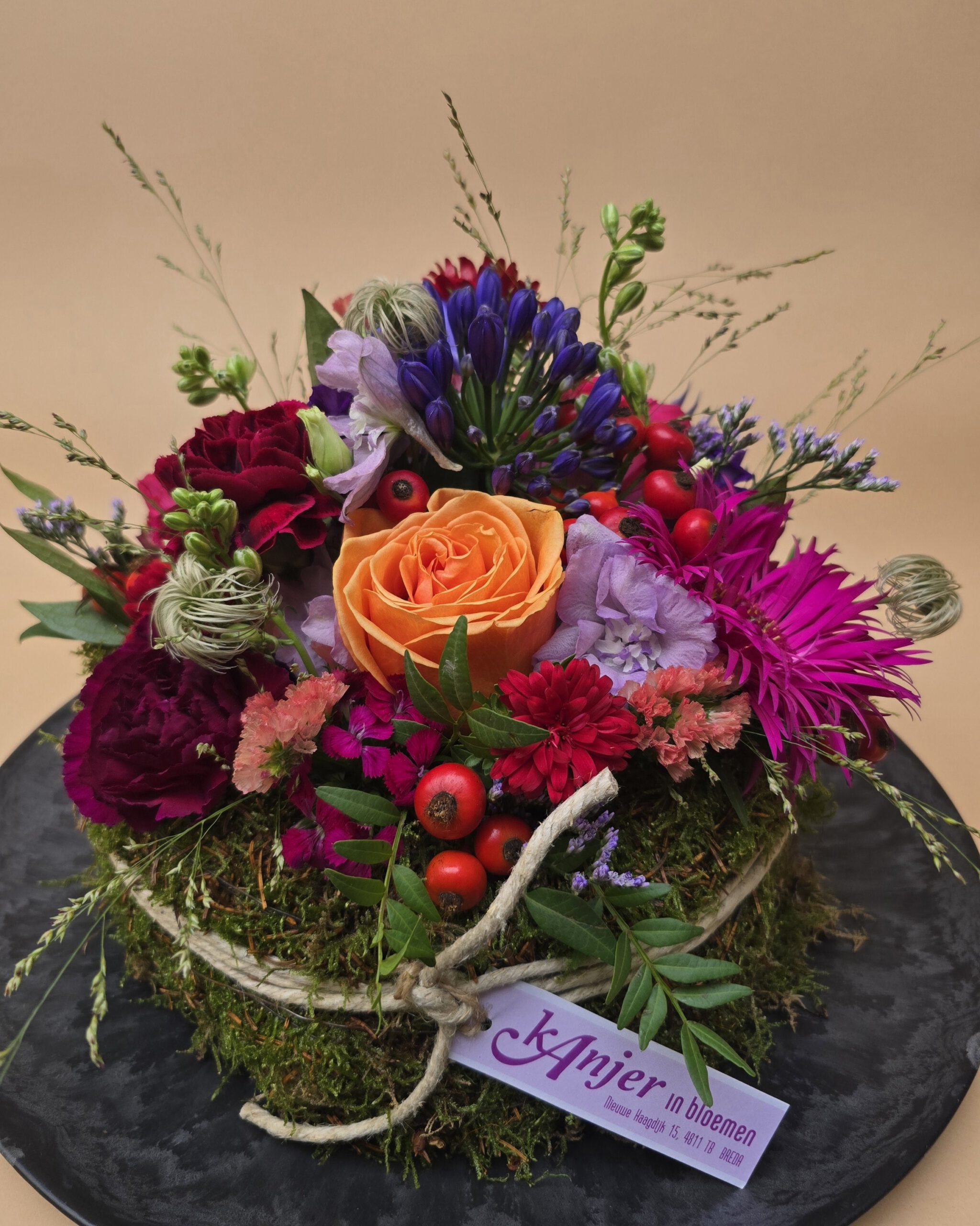 Let op: de bloementaart op de foto is een sfeer impressie. De exacte invulling kan afwijken, afhankelijk van beschikbaarheid.