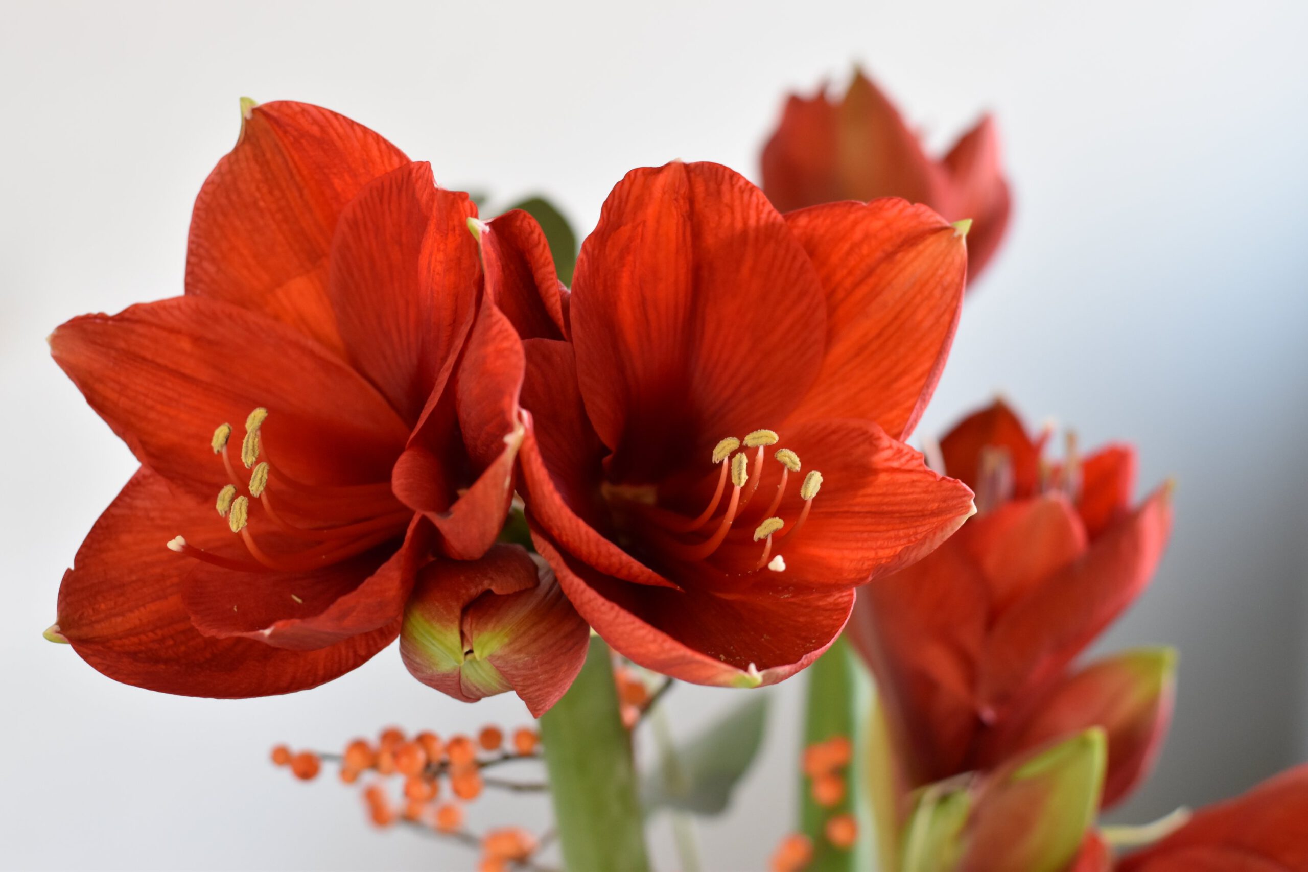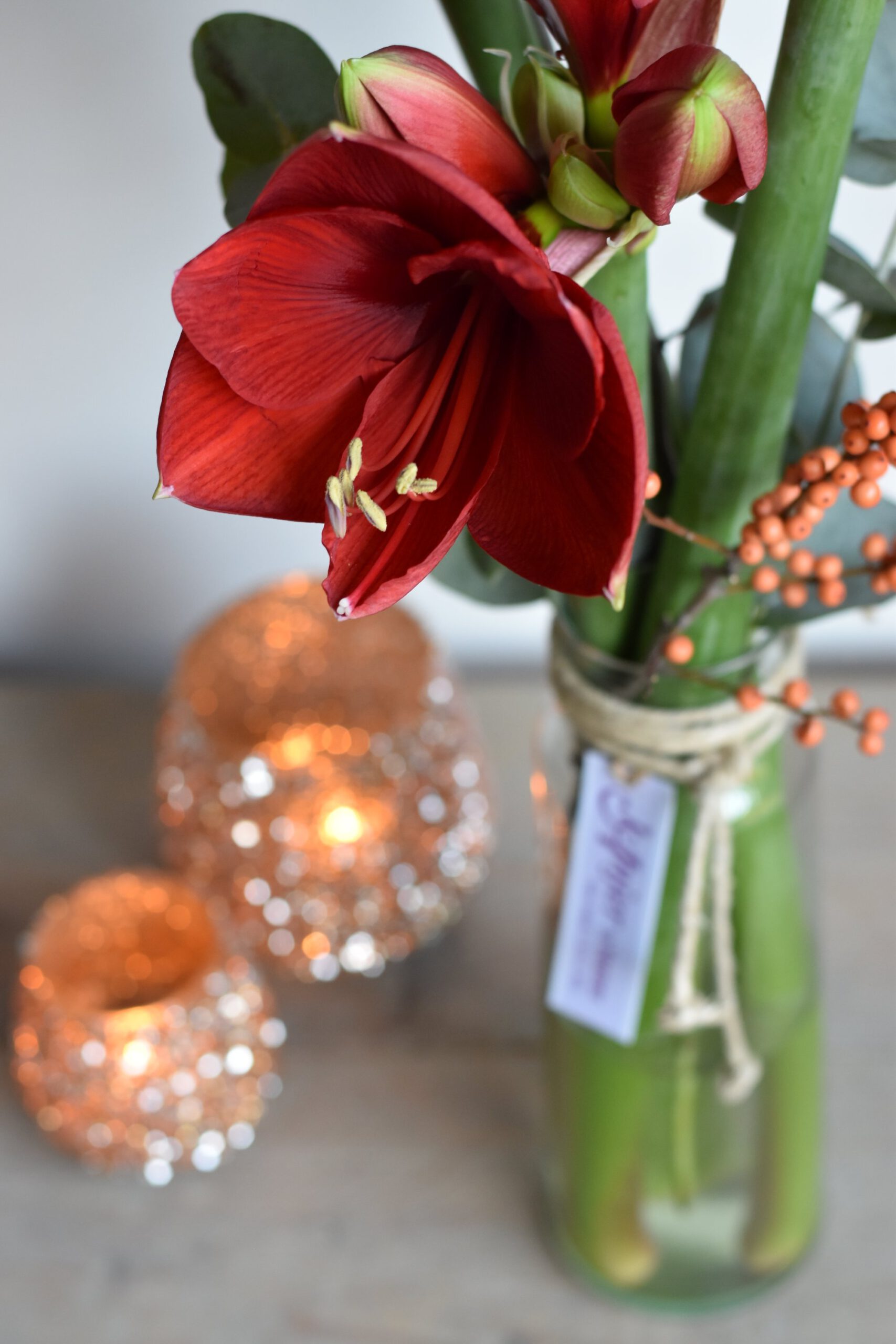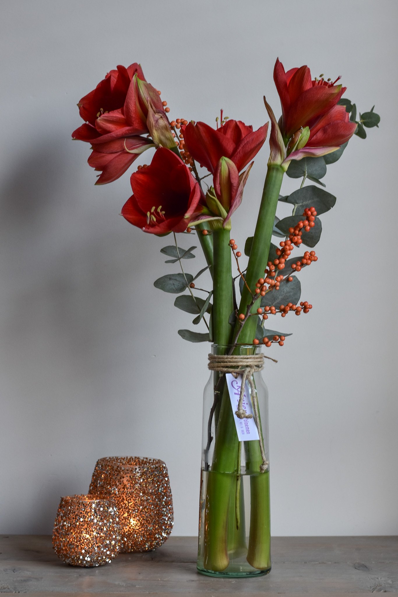 Breng een vleugje luxe in huis met de Rode Amaryllis Elegance. Deze stijlvolle glazen flesvaas is met zorg gevuld met drie dieprode amaryllisbloemen, aangevuld met sprankelende ilex-bessen en frisgroene eucalyptus. Het natuurlijke kleurcontrast en de elegante vormgeving zorgen voor een warme en feestelijke uitstraling die perfect past bij het winterseizoen.