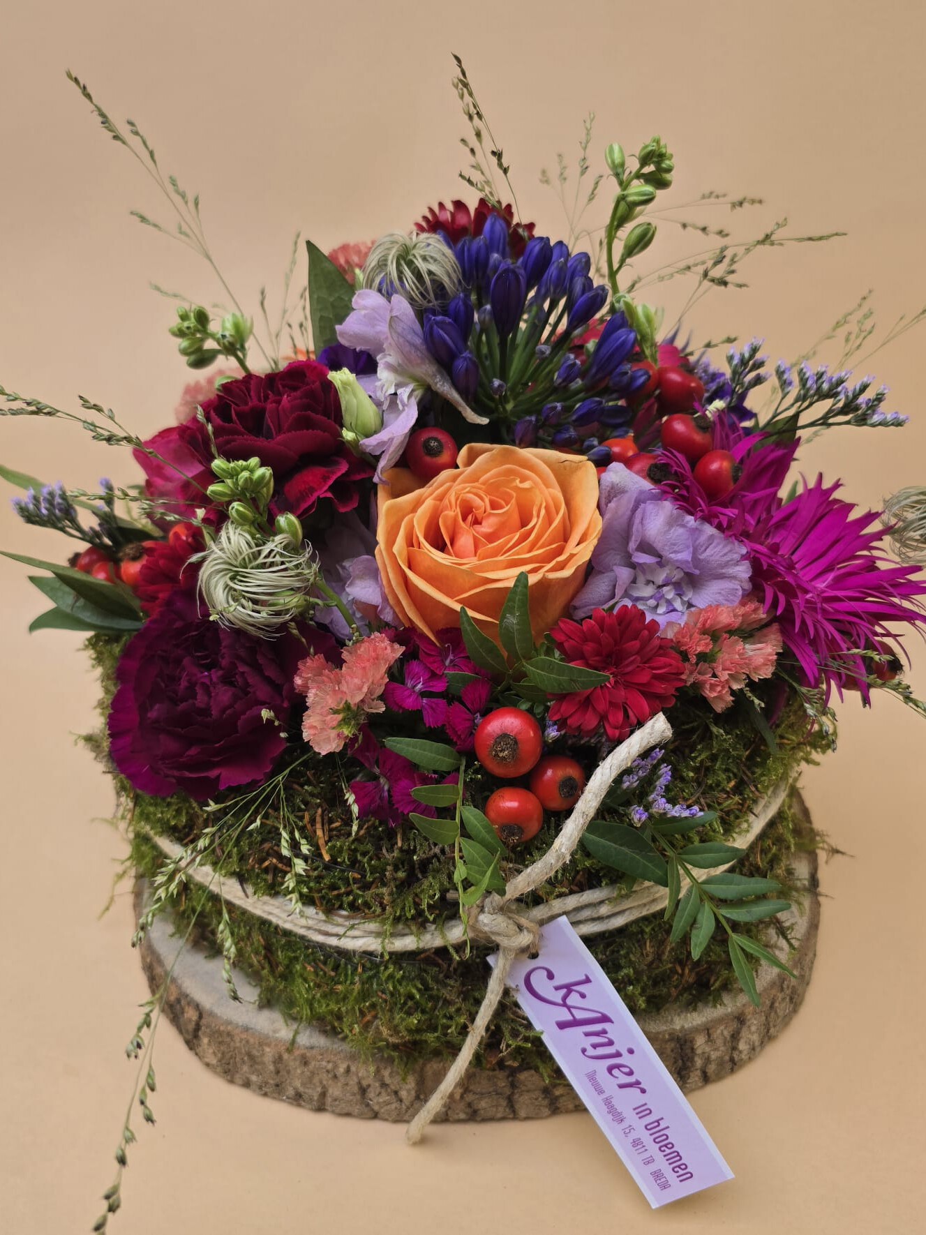 Handgemaakte bloementaart op een robuuste houtschijf van 30 cm, gemaakt met…